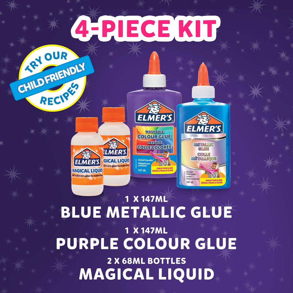 Unlock endless slime possibilities with Elmer's Cosmic Shimmer Slime Kit. This complete four-piece collection features shimmering Metallic Blue and vibrant Purple PVA glues paired with two bottles of Magical Liquid Activator—everything needed to craft mesmerising, tactile slime. Simply blend glue with activator to achieve your perfect consistency, then watch as your creation transforms into a glittering masterpiece. Mix colours for infinite cosmic variations or keep them separate for bold, individual effects. Ideal for sensory play, stress relief, and imaginative crafting, this washable formula ensures worry-free fun. Perfect for creative minds seeking satisfying, hands-on entertainment.