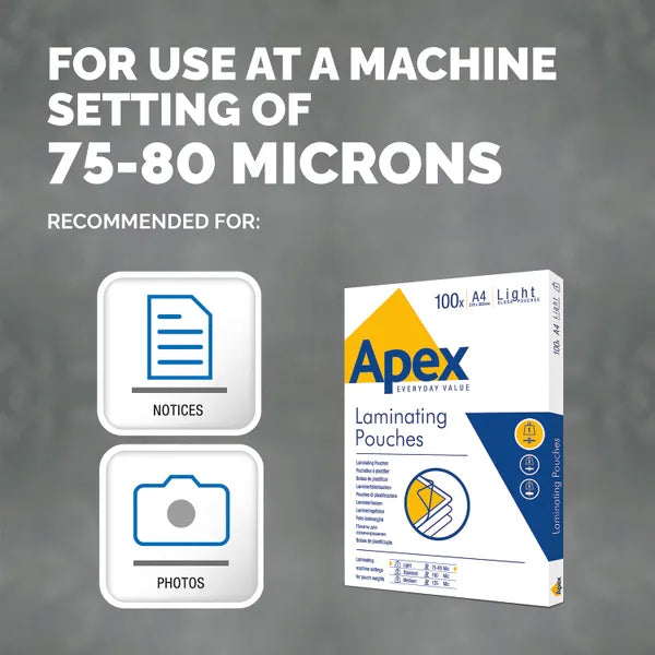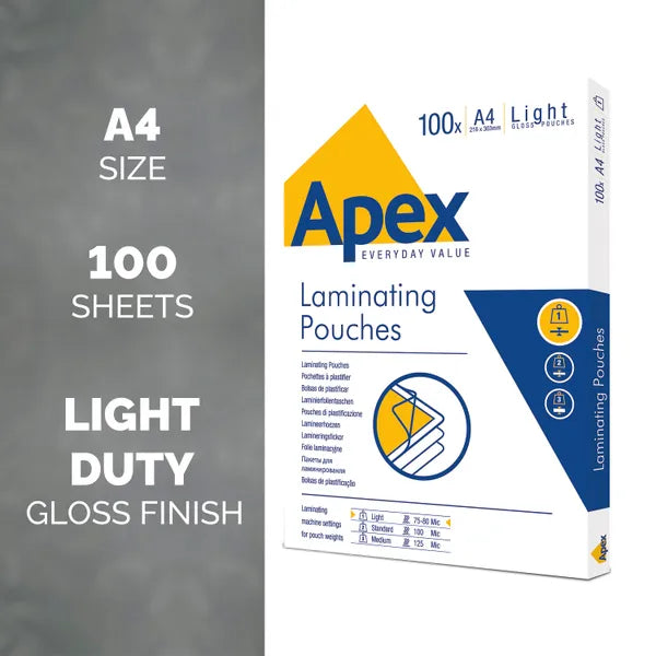 Transform your documents with Fellowes Apex laminating pouches—the smart, budget-friendly solution for professional protection. This pack of 100 A4 pouches delivers crystal-clear results, keeping your notices, posters, and important papers safe behind a durable plastic shield. Perfect for light-duty laminating tasks, these pouches offer excellent value without compromising on quality. Give your materials a polished, protected finish that resists wear and maintains clarity. Ideal for offices, schools, and businesses seeking reliable lamination at an unbeatable price.