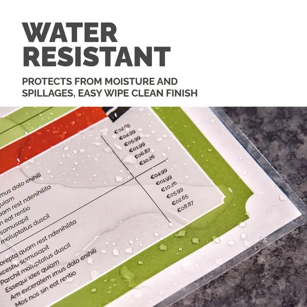 - Protects documents under a clear layer of plastic