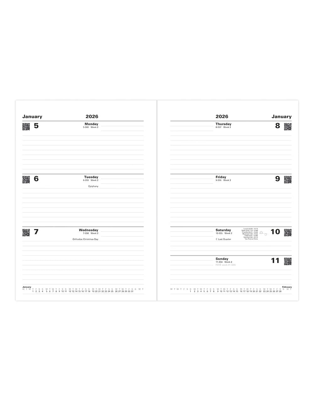 This elegant hardback A5 diary features a luxurious smooth leather-look cover with stylish foil embossing. Ideal for organising your schedule whether you're out and about or working at your desk, it offers a practical week-to-view format. Presented in English for easy use throughout 2026.