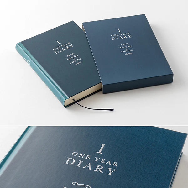 This one-year diary features a single page for each day, styled like a classic hardcover Western book, measuring 180mm tall by 128mm wide and 24mm thick. It contains 368 pages with 8mm wide horizontal lines, providing ample space for daily entries. A built-in bookmark string helps you easily keep your place, making it an elegant and practical choice for organizing your year.