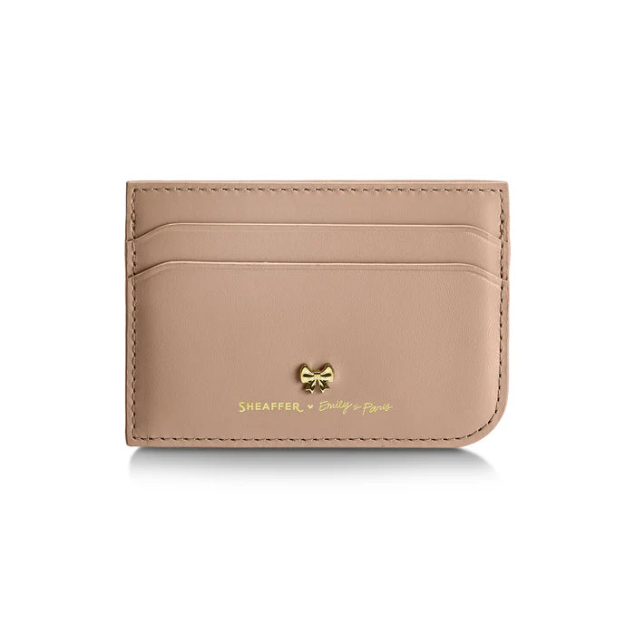 Experience timeless luxury with this exquisite Sheaffer 100 Emily in Paris collection. The champagne gold ballpoint pen features a premium brass body with elegant PVD trims, crowned with an Eiffel Tower insignia and signature bow-shaped clip—a true statement of refined taste. Paired with a sumptuous full-grain leather card holder in matching champagne gold accents, this sophisticated set elevates your everyday carry. The leather holder combines practicality with prestige, offering RFID-protected storage for up to four cards plus a convenient slip pocket, all finished with an iconic bow emblem. Compact yet luxurious, this curated duo captures the essence of Parisian elegance and makes an unforgettable gift for those who demand both style and substance in their accessories.
