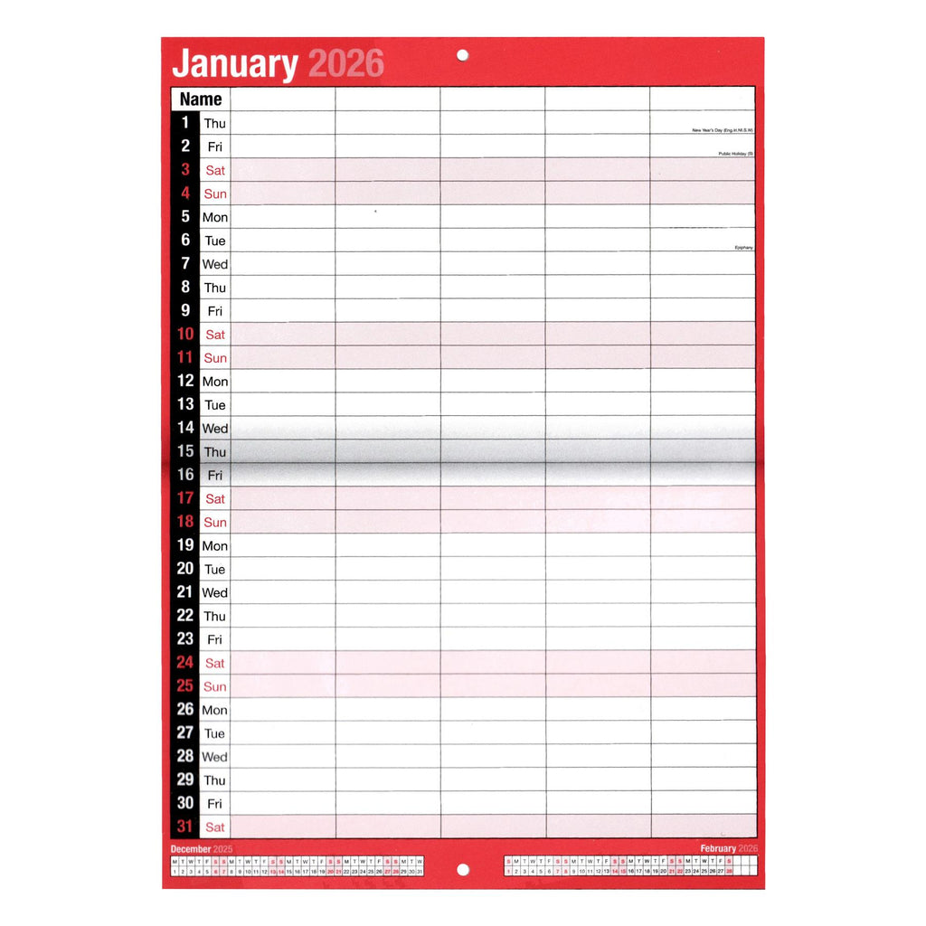 This striking red and white calendar offers a clear month-to-view layout with a bold grid, perfect for tracking appointments, deadlines, and events in 2026. Its practical hanging hole makes it easy to display on walls or bulletin boards. With five columns, it provides ample space for daily notes, reminders, and tasks. Perfect for students, professionals, or anyone aiming for efficient time management. It also includes a forward planner for 2027 and a Notable Dates section for quick access to holidays and special occasions. Sized at 42cm x 29.5cm, it’s designed for clear, organised planning.